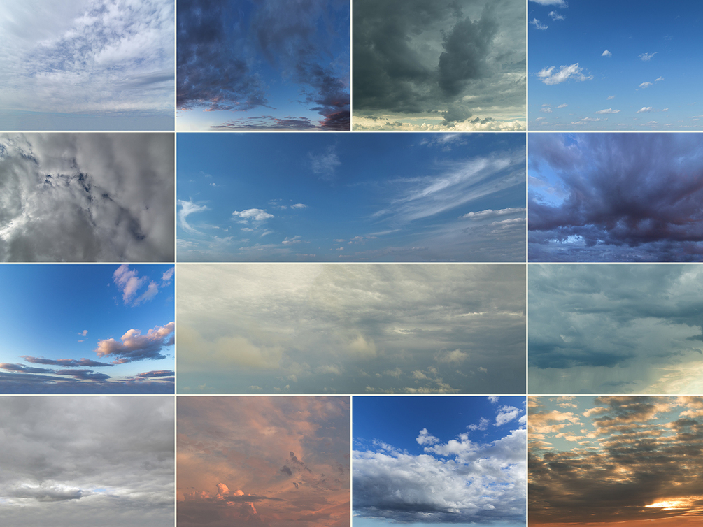 There are a variety of images to choose from. Different times of day, different focal lengths, different types of clouds and different types of weather and cloud coverage. You'll have plenty of options to match your footage or photo!